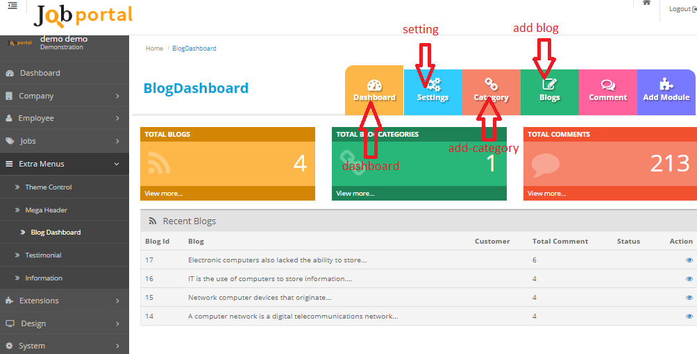 jobportal script allow admin to add blog feature like comment, Tag, Social Sharing full page view etc.