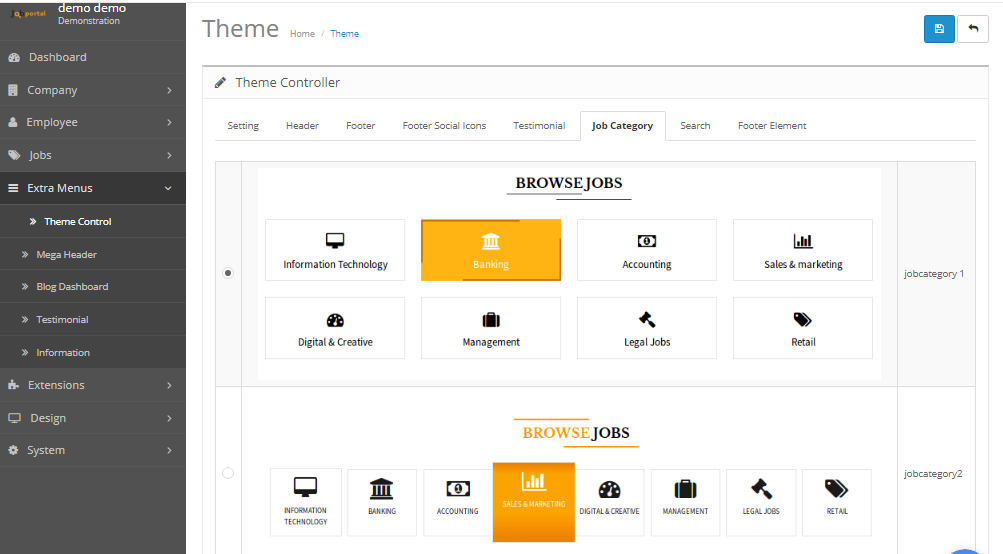 - Jobportal Script allow 2 type of Job category layout on home page in front, you can Choose and apply your layout.