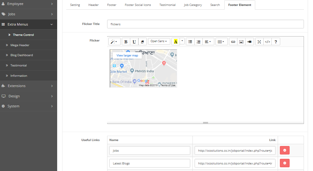 - Footer Element Here admin can add or update footer element like map, Footer link etc..