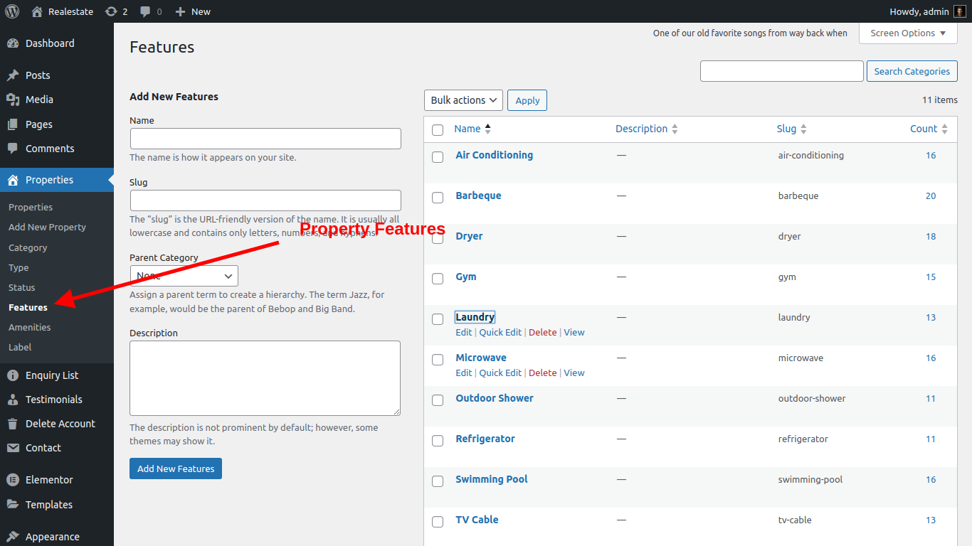 Property Feature a feature list of property here admin can add lots features related to property like: Air Condition , Balcony , Garage etc... admin can easliy add and manage features from admin panel. See screenshort below.