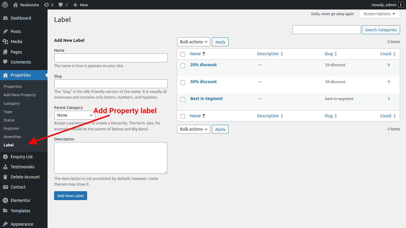 Property label is a attribute of the property. admin can create diffrent offers using this label. like: 20% OFF , Best In Segment, Summer Sale etc... admin can easliy add and manage labels from admin panel. See screenshort below.