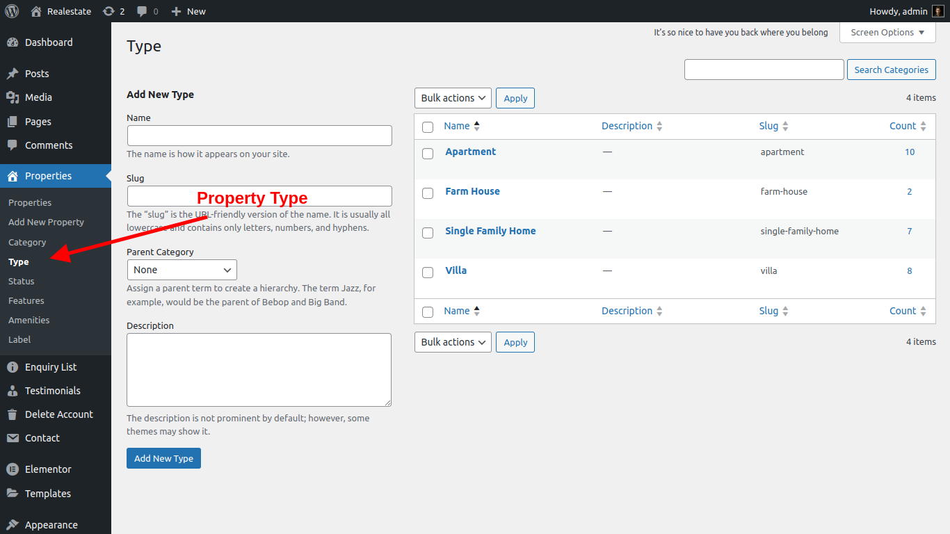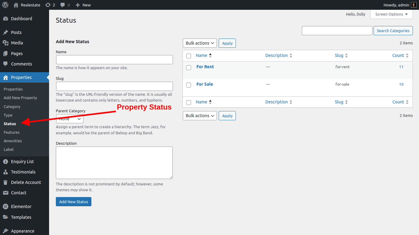Property Status/type its dispay your listing in types like Rent / sale / lease etc. user can also filter data in front-end by types and status, admin can easily add property status/type from admin panel.please see screenshort below: