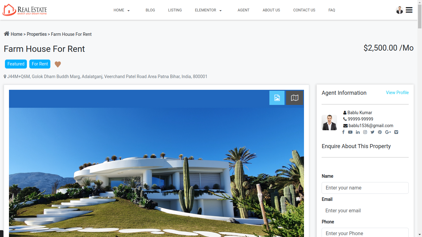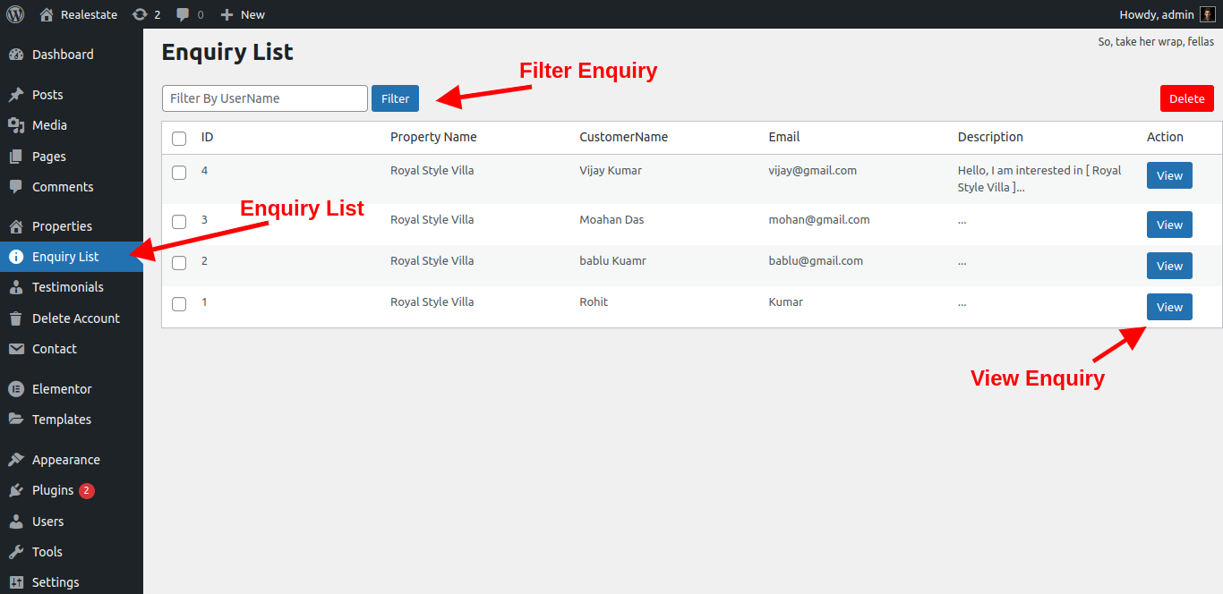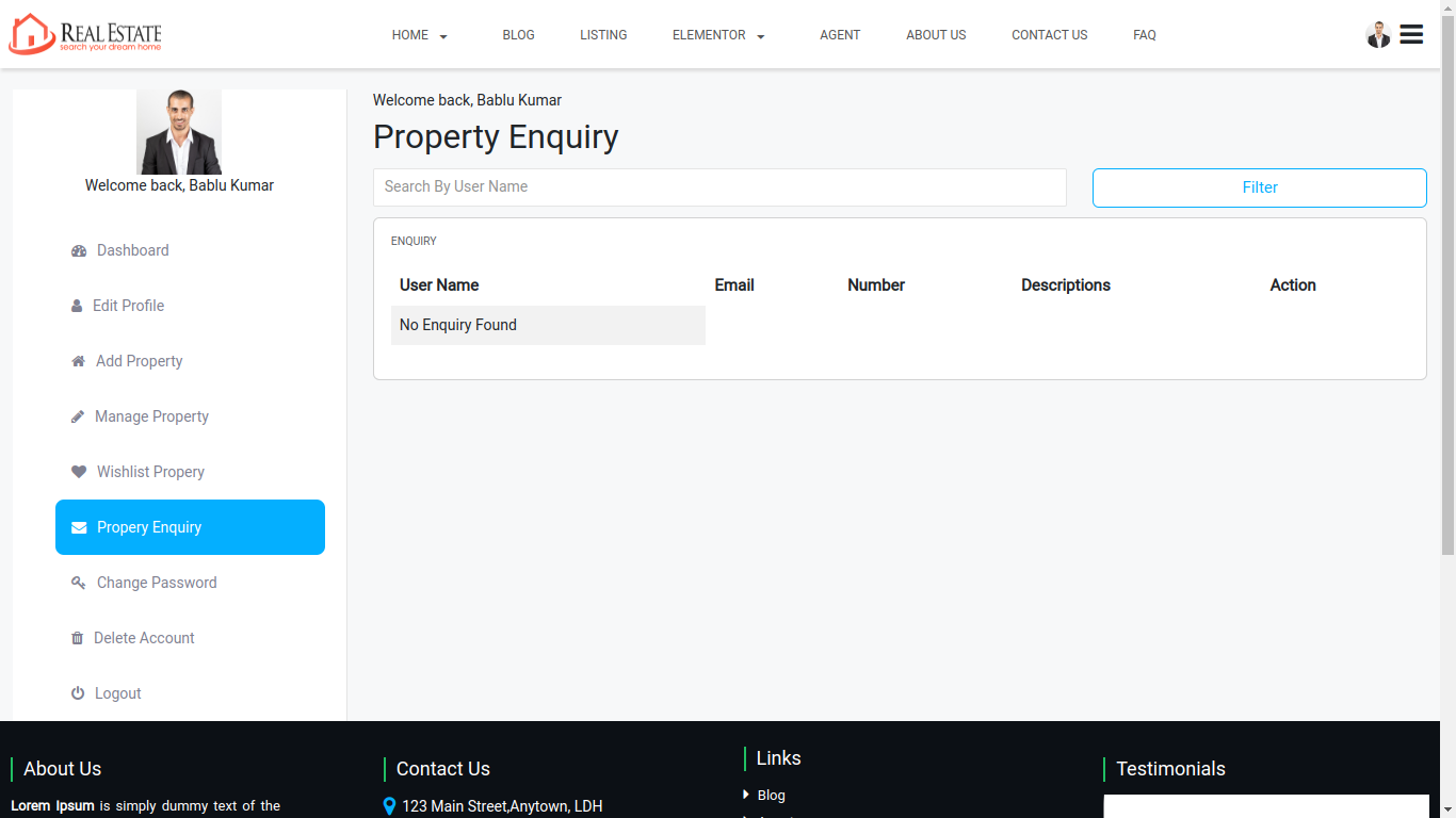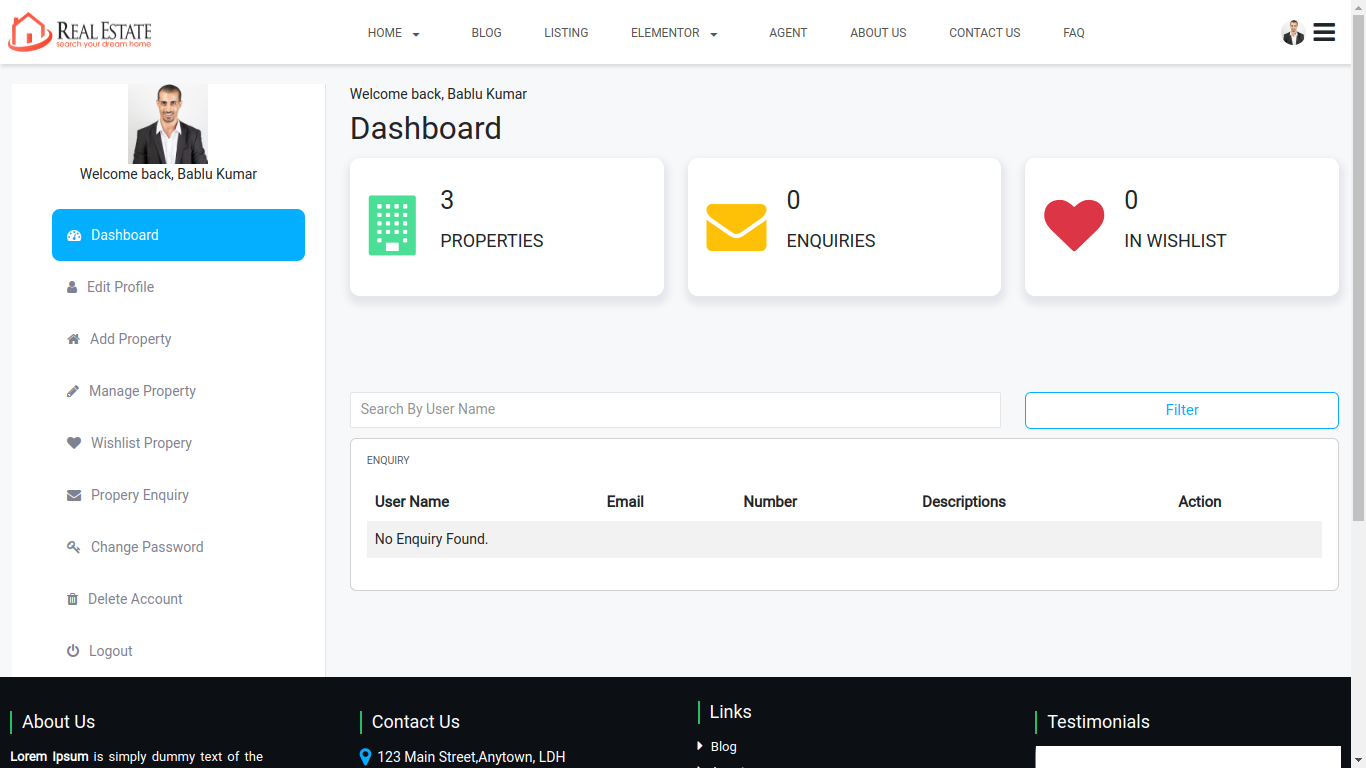 Enquiry list is display all enquiry of your property listing which is coming from customer and agents also view the enquiry notification on agent dashboard. admin can manage all enquiry listing from admin panel