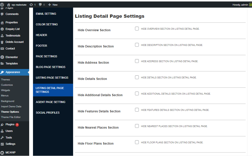 Here you can manage property Listing Details page section hide and show LiKE Property descripton, video, calcultor etc.